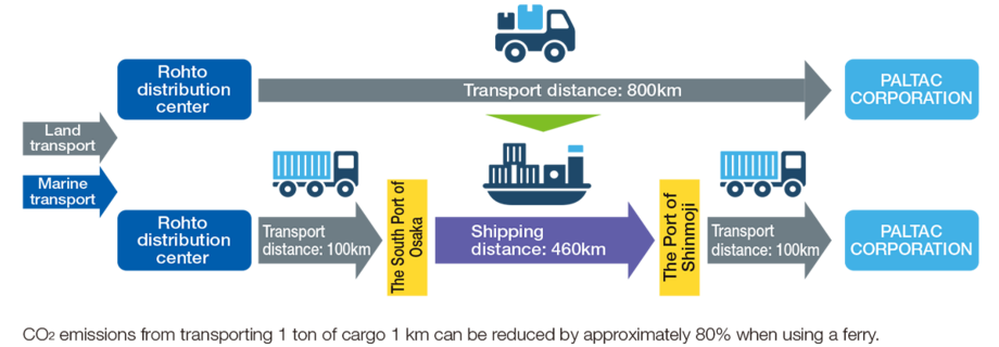 Together with our agents, we are promoting a modal shift from land transport (trucks) to more efficient marine transport (ferries), starting with deliveries to the Kyushu region. This initiative is helping to address the driver shortage, improving the working environment for drivers involved in long-distance transport, and contributing to the reduction of CO2 emissions.
