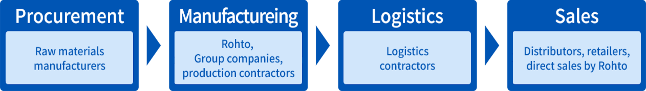 In July 2023, we revised our Supplier CSR Guidelines and renamed them the "Rohto Group CSR Procurement Guidelines." With the aim of thoroughly communicating these items to all our business partners, we have been working to obtain consent forms regarding CSR procurement, and all of Rohto Pharmaceutical's business partners have agreed to them. By seeking the understanding of our business partners and taking measures to address any issues, we are promoting socially responsible manufacturing throughout the entire supply chain.