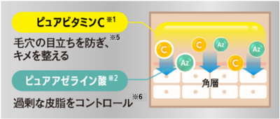※1:アスコルビン酸(保湿成分)、※2:アゼライン酸(整肌成分)、※3:角層まで、※4:肌にうるおいを与え毛穴を目立たなくさせる