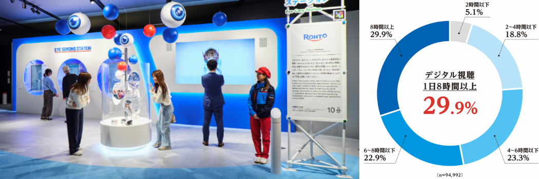 ロート製薬株式会社(本社:大阪市、社長:瀬木英俊)は、2025年日本国際博覧会(大阪・関西万博)の大阪ヘルスケアパビリオンに出展した「ミライのアイケア」ブースにおいて、体験者10万人以上※1の目の健康データを収集・解析しました。その結果、約3割の方が平日8時間以上デジタル視聴を行い、視聴時間が長い人ほど目の不調を実感する割合が高いことが判明。さらに、「目年齢」※2を一つの指標として、現代人が抱える目の実態や肌との関係が明らかとなってきました。