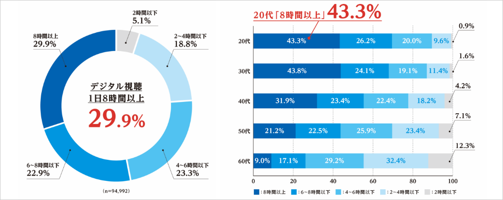 - 20~30代は4割以上が8時間超の長時間視聴