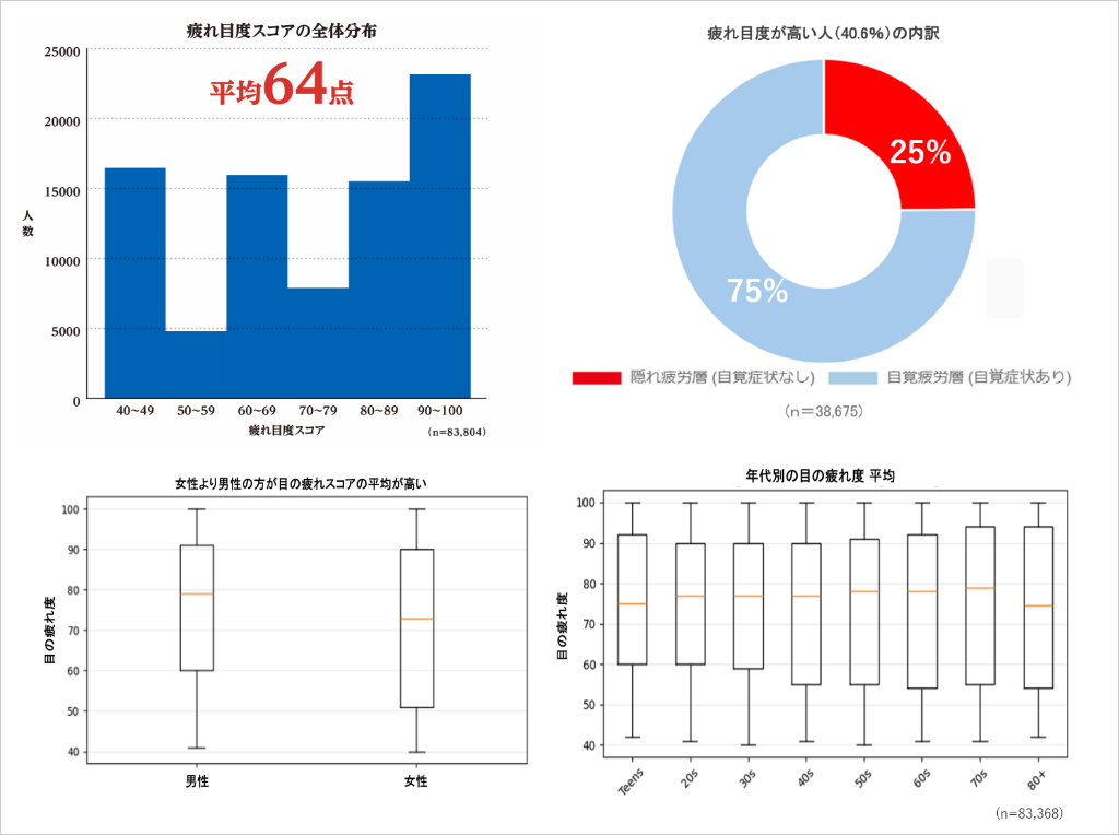 - 疲れ目のスコアが80点以上の方のうち約25%は自覚症状を感じていませんでした。本人は無自覚でも、実際には目は疲れている方が4人に1人はいる可能性があることも示唆されました。