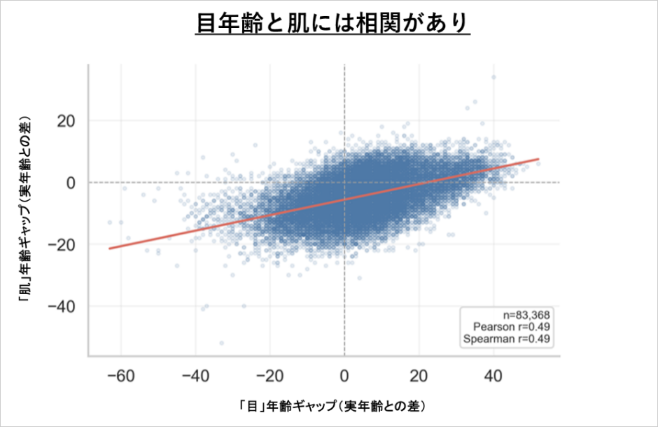 「目」年齢と「肌」年齢のギャップには正の相関関係が見いだせました。