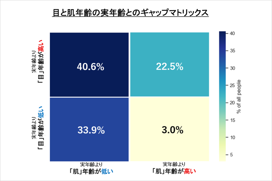- 肌のスコアは低い(若い)が、目年齢は高いという方が割合としては最も多く40.6%