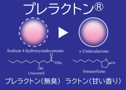 - プレラクトンはニオイ悩みにつながる酸っぱい・ツンとした「不快臭」の一部を低減させると同時に甘い香りへ変換される