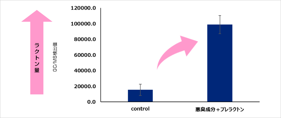 悪臭成分の酸の混合物(酢酸、イソ吉草酸、イソ酪酸、4-メチル-3-ヘキセン酸)にプレラクトンを添加したところ、コントロール(水)を添加したものと比較して、ラクトンの量が優位に増加することが確認されました。(図3)