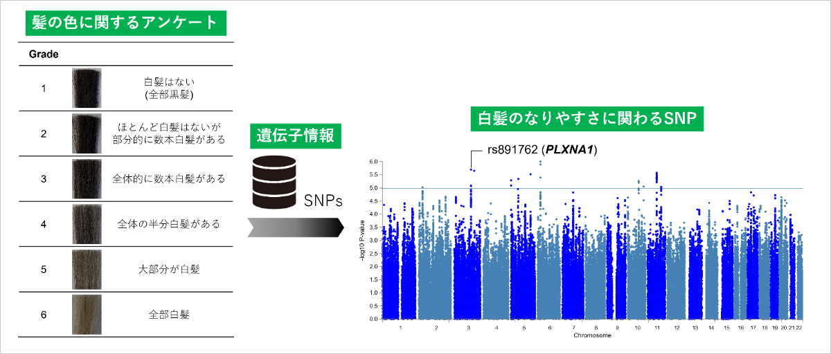 日本人2,186人(平均年齢42.7歳)を対象に唾液サンプルよりDNAを抽出し、一塩基多型※4(SNPs)解析を実施した。同被検者にアンケートを実施し、自身の毛染めをしない状態の髪の色に関してGrade1~6の選択肢から最も近いものを選択した。SNPsとアンケートの関連を調べ、白髪のなりやすさに関わるSNPとしてrs891762を発見した(P < 1E-05)。eQTL解析の結果、PLXNA1遺伝子を特定した。(ロート製薬研究所で実施)