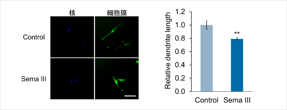 細胞膜を染色した正常ヒト表皮メラノサイトを播種し、24時間後にSema IIIを添加した。さらに48時間培養後、細胞核染色剤を添加し、イメージング機器を用いて核、細胞樹状突起長解析を計測した(Scale bar: 100mm)。細胞数あたりの樹状突起長を算出し、無添加Controlと比較した相対突起長をグラフ化した(n=3; mean ± SD. **P < 0.01; Student’s t-test vs. Control)。(ロート製薬研究所で実施)