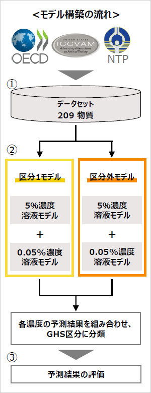 これまで我々は、Draize試験※7の動物実験代替法としてガイドライン化されたSTE試験法のin vitro試験データを用い、化学物質の構造情報や物性値等から、眼刺激性を予測するモデルの開発を進めてきましたが、この度、新たに区分1と区分外の双方を高精度に予測できるモデルの構築に取り組みました。
