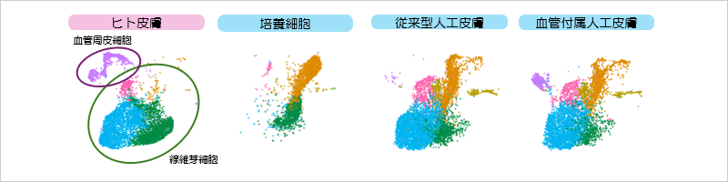 正常ヒト表皮角化細胞、正常ヒト真皮線維芽細胞、ヒト臍帯血管内皮細胞の3種の細胞を使用して、①シャーレ上で培養した3種の培養細胞、②表皮角化細胞と真皮線維芽細胞の2種の細胞で構築した従来型人工皮膚、③従来型人工皮膚に血管内皮細胞を組み込んだ血管付属人工皮膚を構築し、各サンプルの細胞について単一細胞RNAシークエンス解析を実施。得られた網羅的遺伝子発現プロファイルデータを公開ヒト皮膚細胞データ(Ref. Solé-Boldo et al. Single-cell transcriptomes of the human skin reveal age-related loss of fibroblast priming. Commun Biol 3, 188 (2020).)と統合したうえで主成分分析し、更に遺伝子発現の類似した細胞をクラスリングし、その結果をUMAPに二次元プロットし、遺伝子発現の類似した細胞集団を可視化した(ロート製薬研究所実施)。