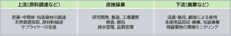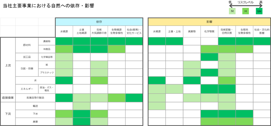 当社グループは、事業活動がサプライチェーン全体を通じて、自然資本に依存し、また影響を及ぼしていることを認識しています。TNFDが推奨するリスク評価ツール「ENCORE」を用い、主要事業である医薬品および化粧品関連のバリューチェーンにおいて、上流(原料調達等)、直接操業、下流(廃棄・流通)それぞれの自然資本との関係を整理し、自然への依存および影響の両面から重要な要素を特定しました。
