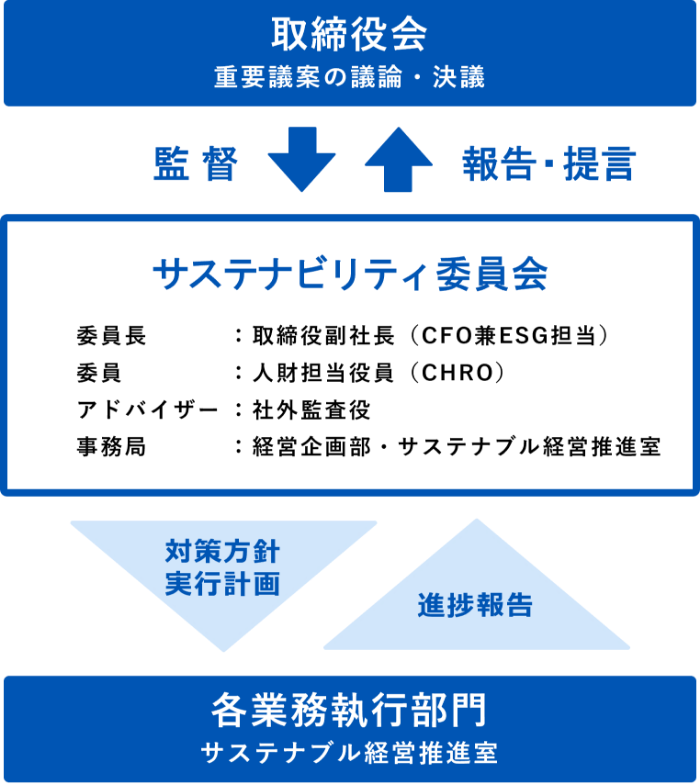 サステナビリティ委員会は、2名の取締役ならびにアドバイザーとして1名の社外監査役によって構成し、委員長は取締役副社長が務めています。取締役副社長は当社グループのチーフファイナンシャルオフィサー(CFO)の役職も兼ねており、環境課題を財務課題として評価・管理する役割を担っています。
