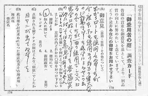 はじまりは1952年(昭和27年)「ロートペニマイ目薬」に同封した「御愛用者の声」調査カードと名付けられたアンケートはがきです。それ以来70年間、おはがきをはじめ電話やメールなどさまざまな形でいただいたお客様の声を大切にしています。2024 年度は3,077件のよろこビックリの声をいただきました。