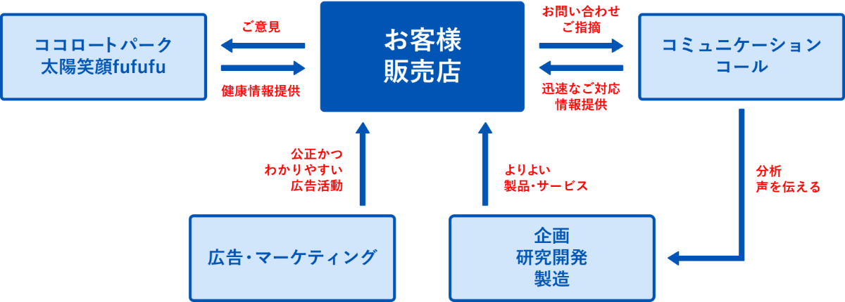 お客様からいただいたご意見、お問い合わせ、よろこびの声は、分析し、よりよい製品・サービスの開発に繋げています。また、適正でわかりやすい表示を心がけ、商品やWebサイト、オンラインショップなどのリニューアルをしています。
